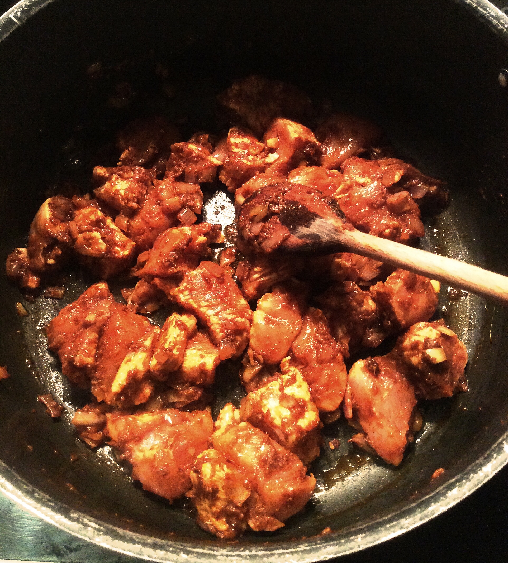 - Après avoir coupé l’ail et les échalotes, les faire revenir dans un faitout avec la pâte de curry puis le poulet coupé en morceaux. Ajouter le lait de coco et laisser mijoter à feu doux 5/10 min.