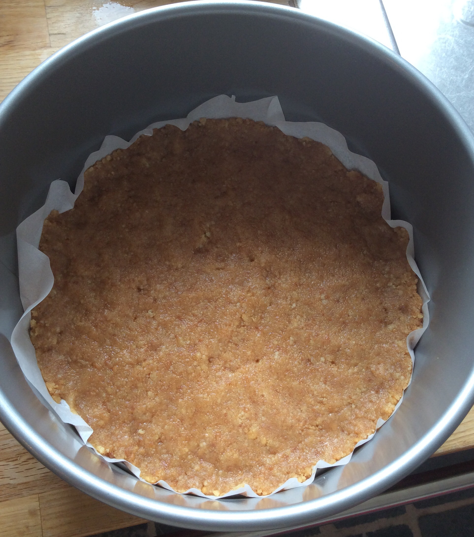 - Pour préparer le fond du cheesecake: faire fondre le beurre. Mixer le biscuit à l’aide d’un robot ou à la main (les morceaux seront moins fins à la main). Mélanger le beurre fondu avec le biscuit et étaler le tout sur le fond du moule (mettre une feuille de papier sulfurisé dans le fond pour faciliter le démoulage).