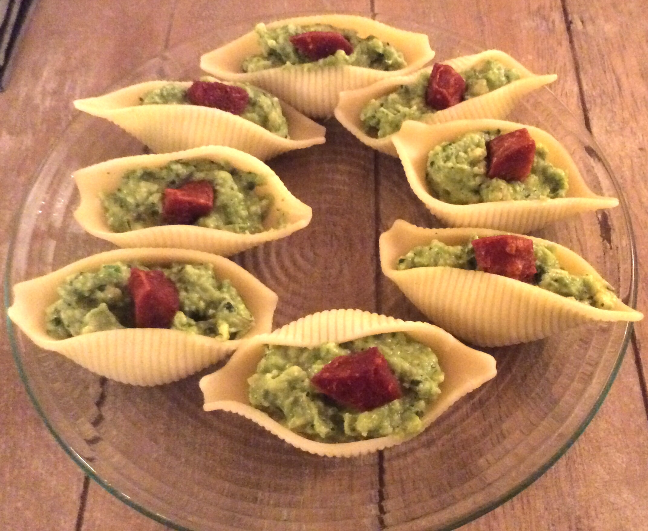 Voilà une idée de tapas sortie de mon imagination avec un reste de grosses pâtes italiennes conchiglie. Je pense que ce serait même encore plus facile à manger avec des pâtes conchiglie de taille normale!