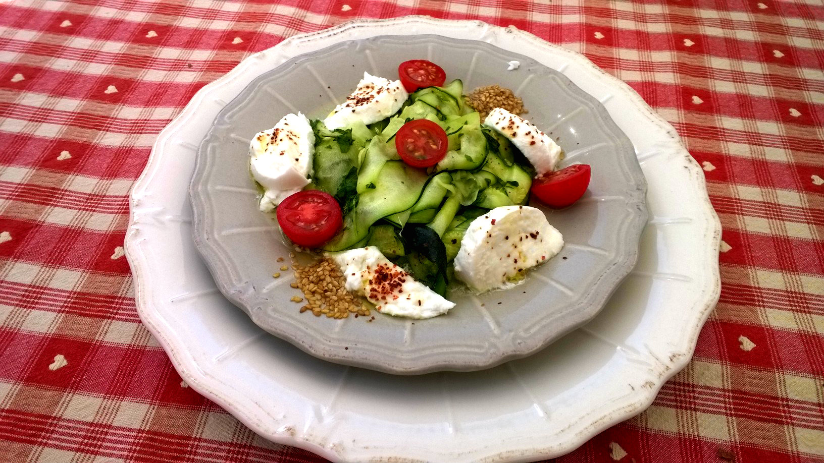 - Dresser les assiettes: mettre les courgettes au milieu puis garnir de tranches de mozzarella parsemées de piment d’Espelette, de graines de sésame et de 1/2 tomates cerise.
