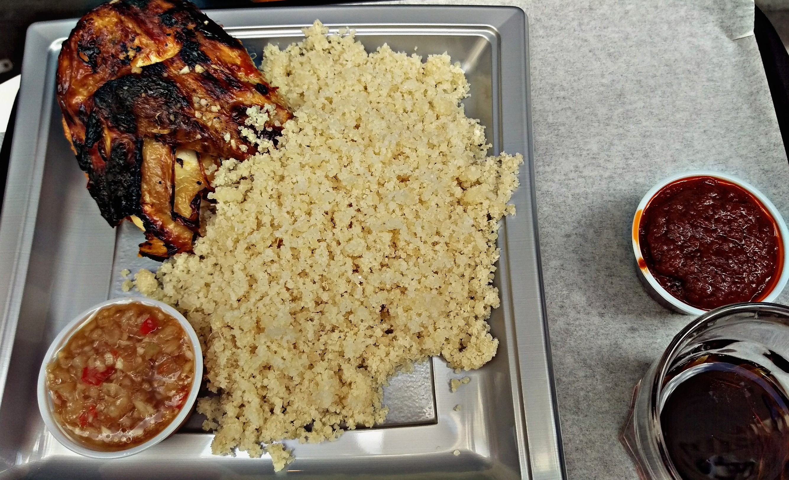 Après avoir un peu hésité sur la formule, nous avons été raisonnable et avons chacune choisi le quart de poulet et c’est déjà bien copieux! Il faut donc avoir une sacré faim pour prendre le demi poulet 🙂 Il était bien grillé et moelleux. Cuisson validée!