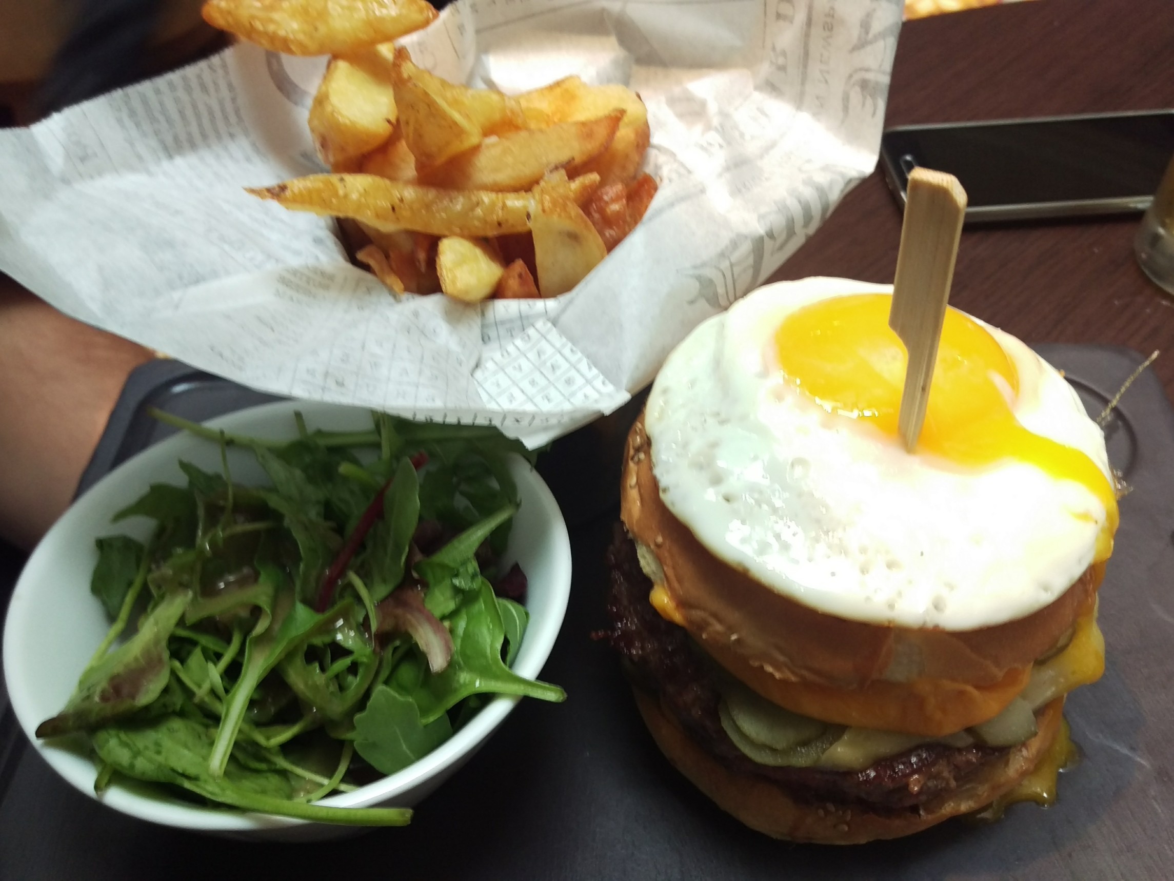 Le burger du robinet d’or était très copieux, servi avec les pommes de terre frites maison. Le prix de ce burger-là est assez cher car avec un œuf en plus: 19 euros. Le cheese burger et blue cheese burger sont à 16,20 euros.