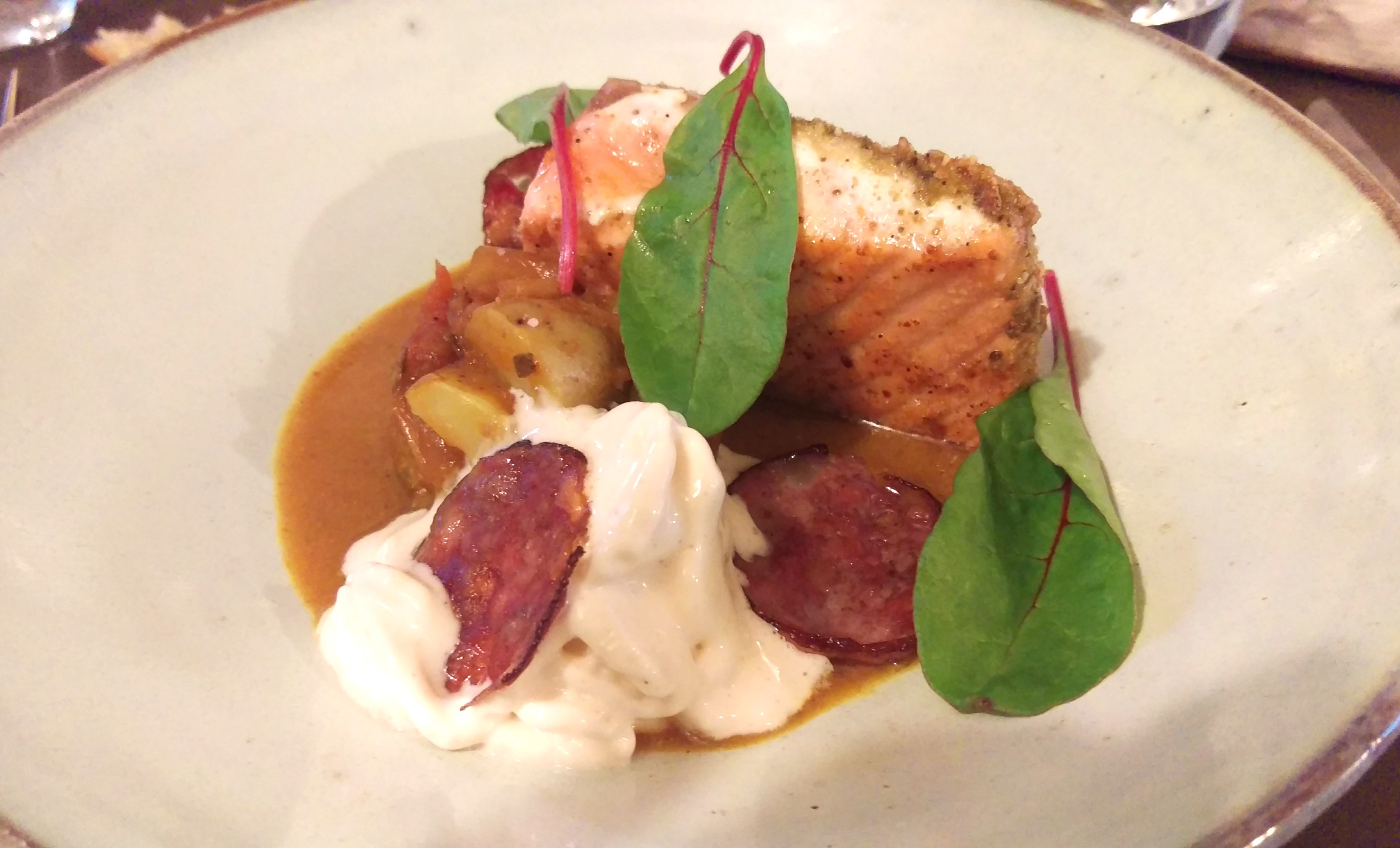 Le plat était heureusement plus copieux et aussi très bon. Le saumon était parfaitement cuit (légèrement rosé) et l’association avec une mousse accompagnée de tranches de saucisses fumées était très réussie.