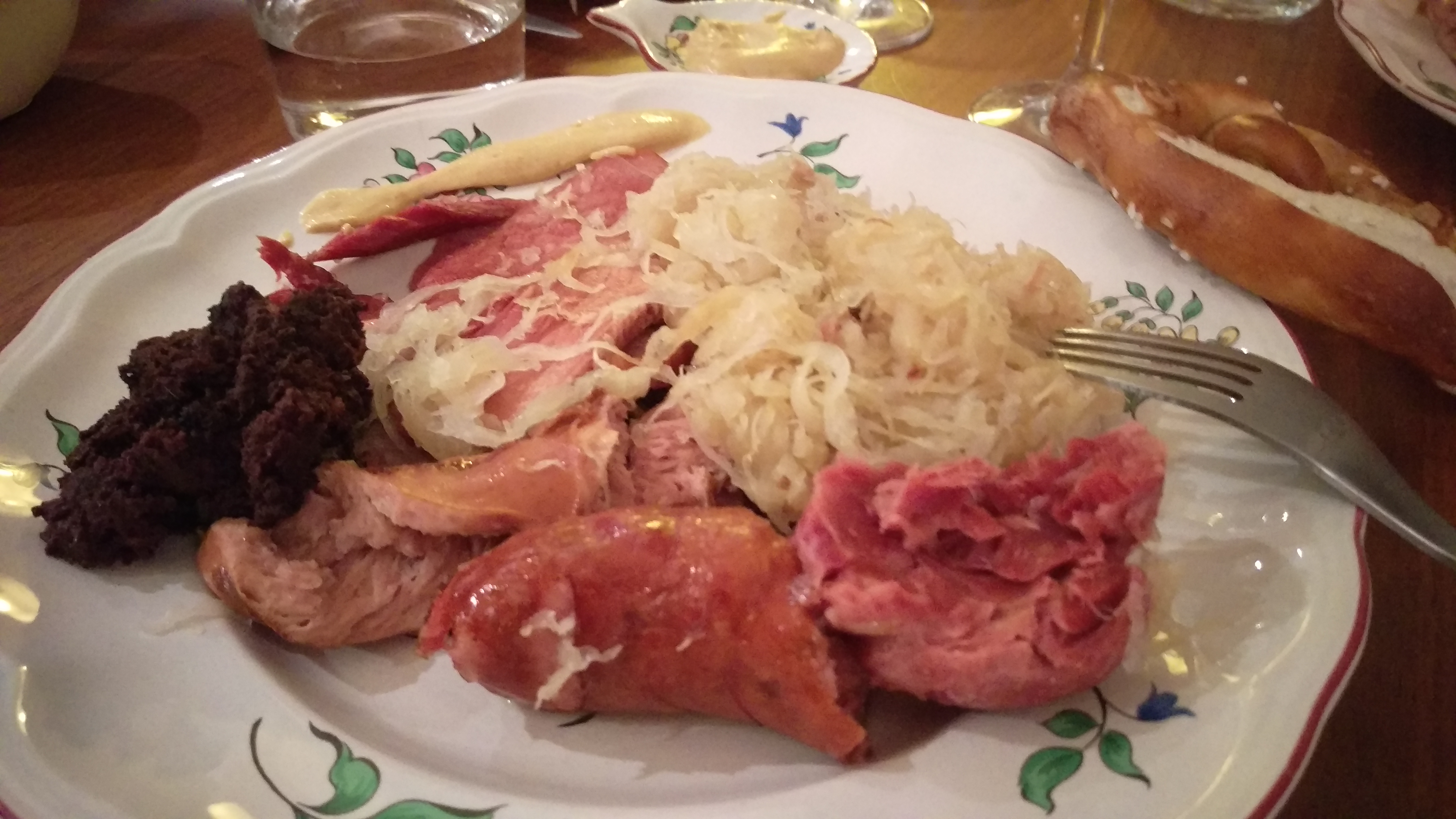 Pour 4 personnes, nous avons pris 1,2 kg de choucroute au champagne, 4 morceaux de palette fumée cuite, 2 jarrets cuits, 4 francfort, 2 saucisses fumées cuites, 2 saucisses au cumin, une dizaine de rondelles de saucisse de Morteau, 1 boudin noir et 4 bretzels (Total: 62€). Autant dire qu’on avait largement de quoi se régaler!