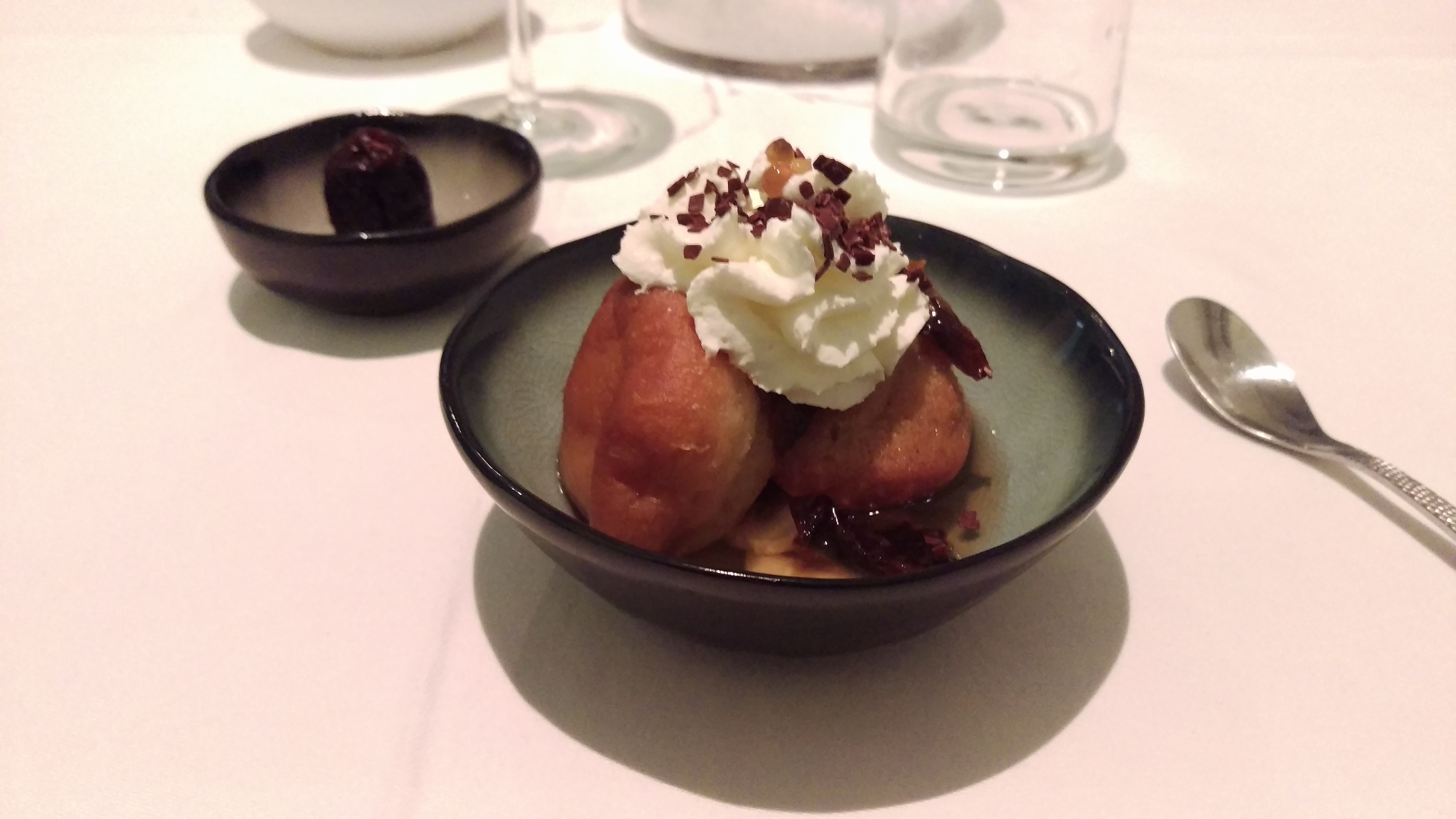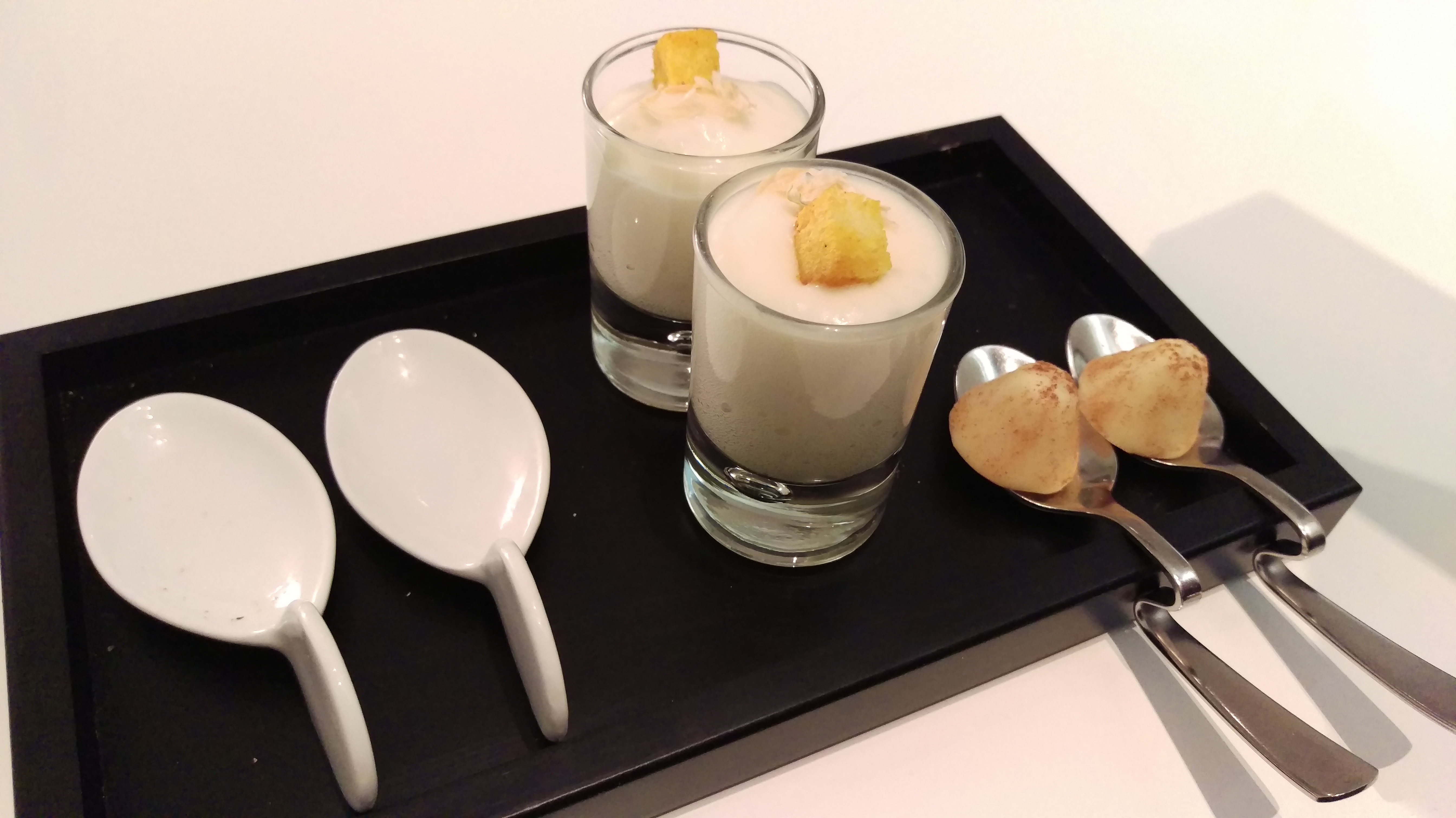 Après l’apéro et le choix de notre menu, nous avons été conduit dans une autre salle (5 tables en tout, une autre salle est à part avec 9 autres tables). Notre table était très grande et bien éloignés des autres clients ce qui est agréable pour un dîner en amoureux. La déco est très sobre en gris/noir/blanc.