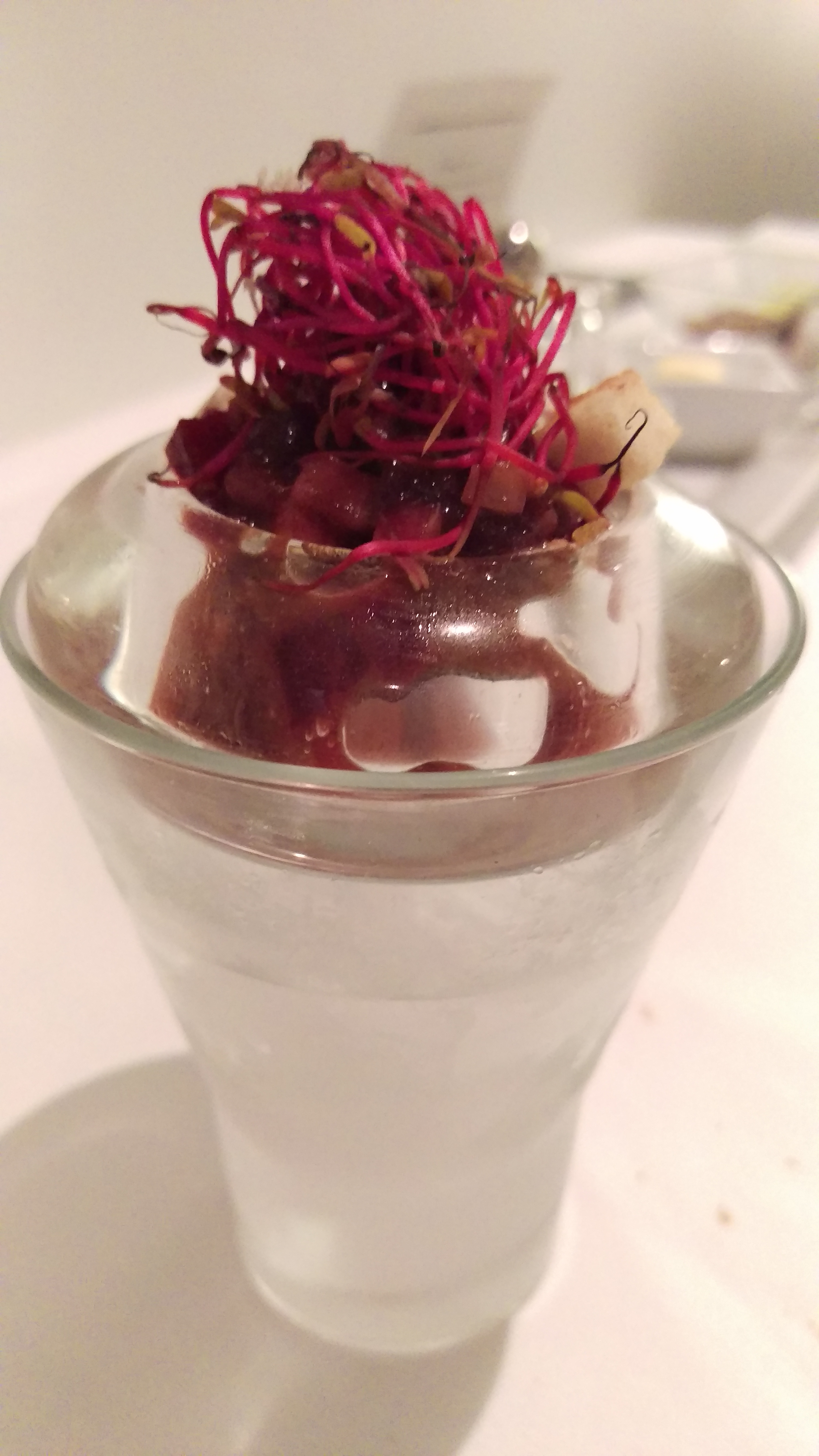 Le tartare de kangourou à la betterave (servi dans un verre glacé)