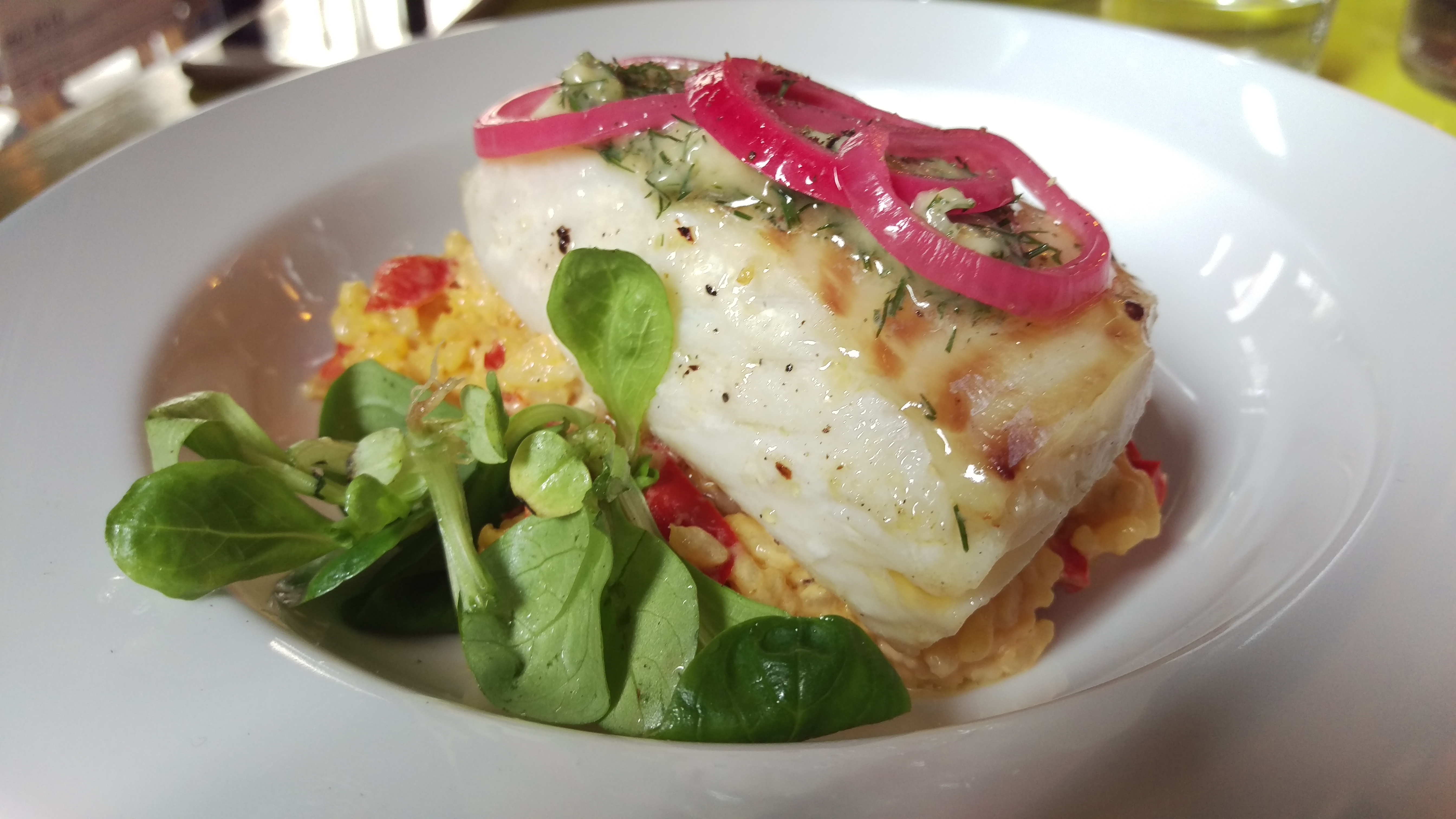 Le plat était juste délicieux: un dos de cabillaud très bien cuit, bien servi et bien assaisonné à l’aneth sur un risotto au poivron.