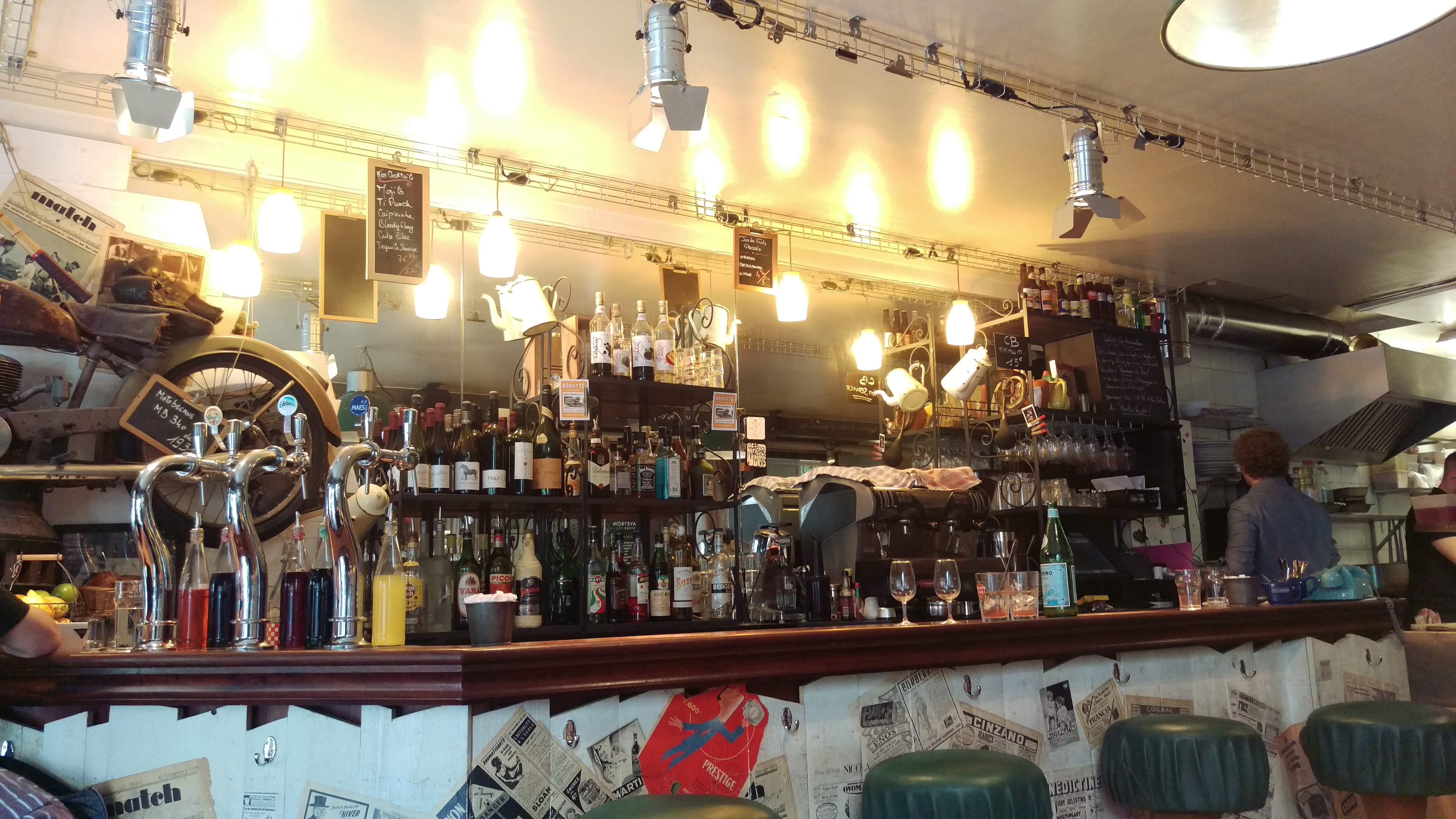 Côté déco, un grand bar longe la salle avec la cuisine ouverte au bout. Les tomettes au sol et la déco un brin vintage au mur rendent ce bistro de quartier très chaleureux.