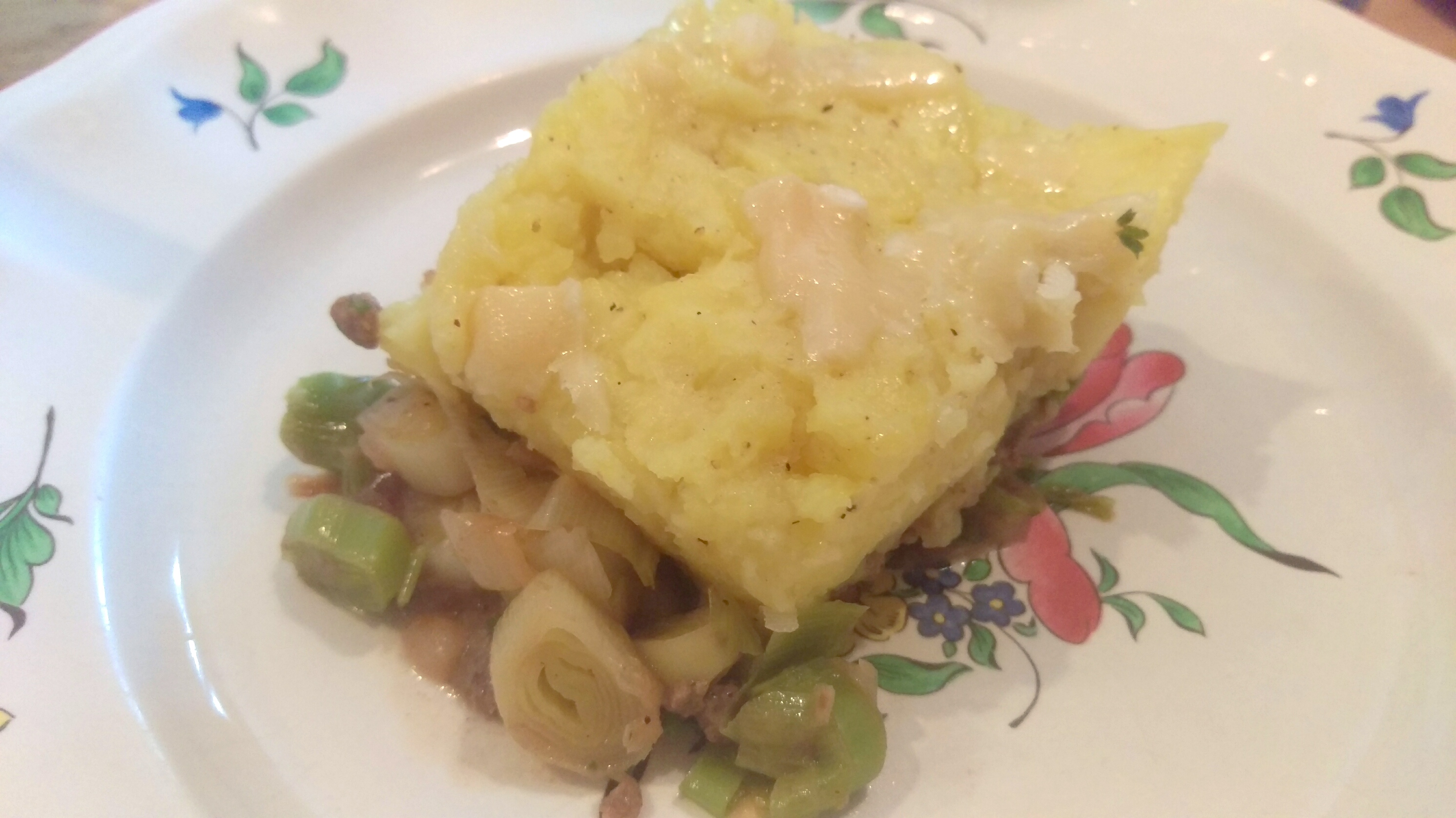 Voici une variante du hachis parmentier en ajoutant des poireaux dans le fond du plat. Cela rend la recette plus fondante quand le hachis est fait avec du steak haché (un peu sec à la base).