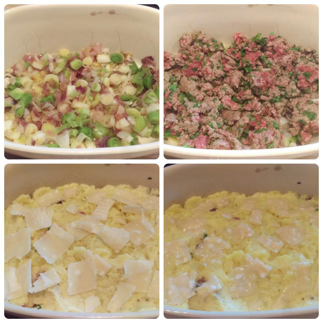 - Etaler le mélange de viande sur les poireaux puis la purée de pomme de terre.