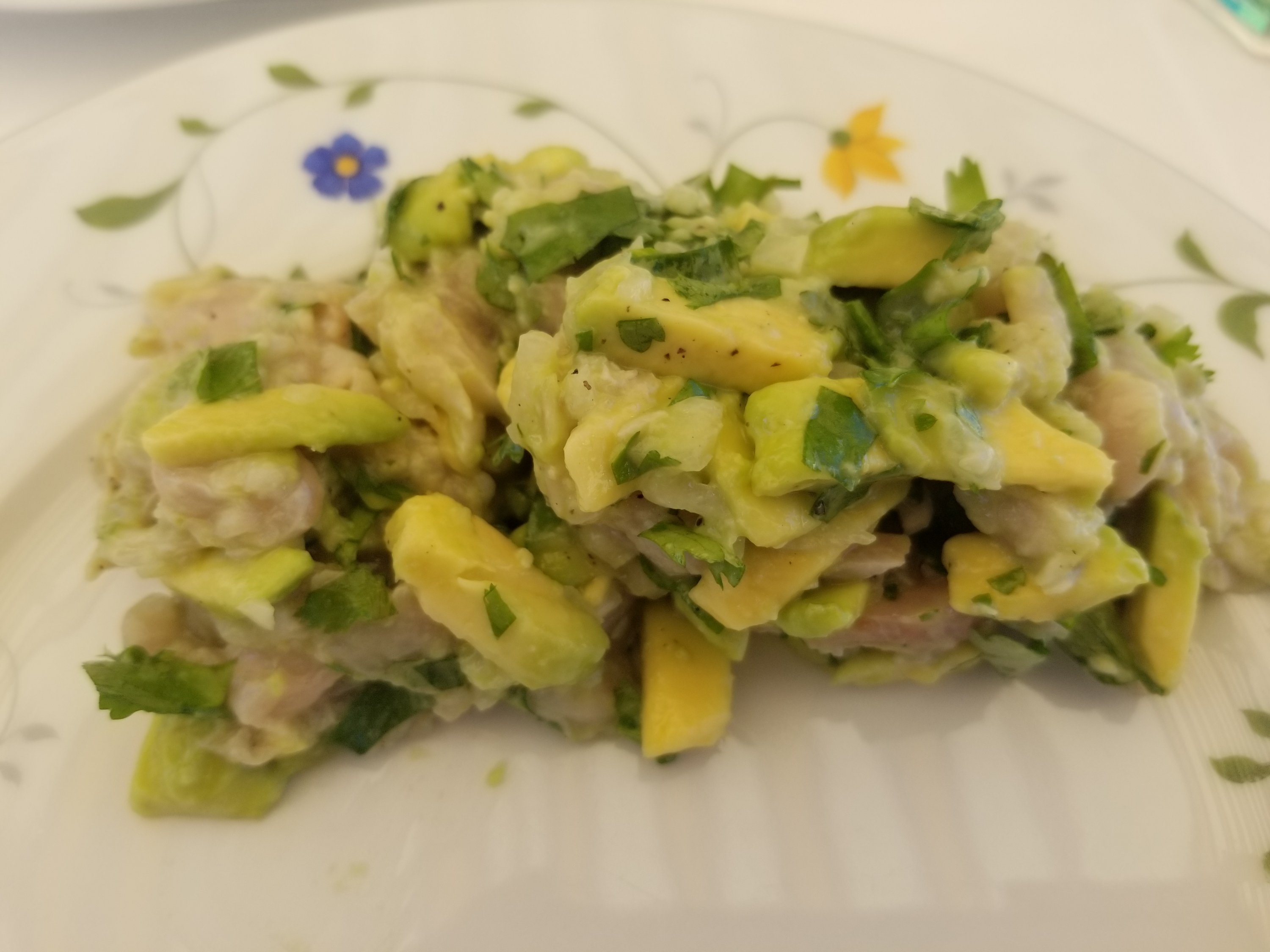 - Emincer l’oignon frais et couper l’avocat en petits dés et l’ajouter au saladier.