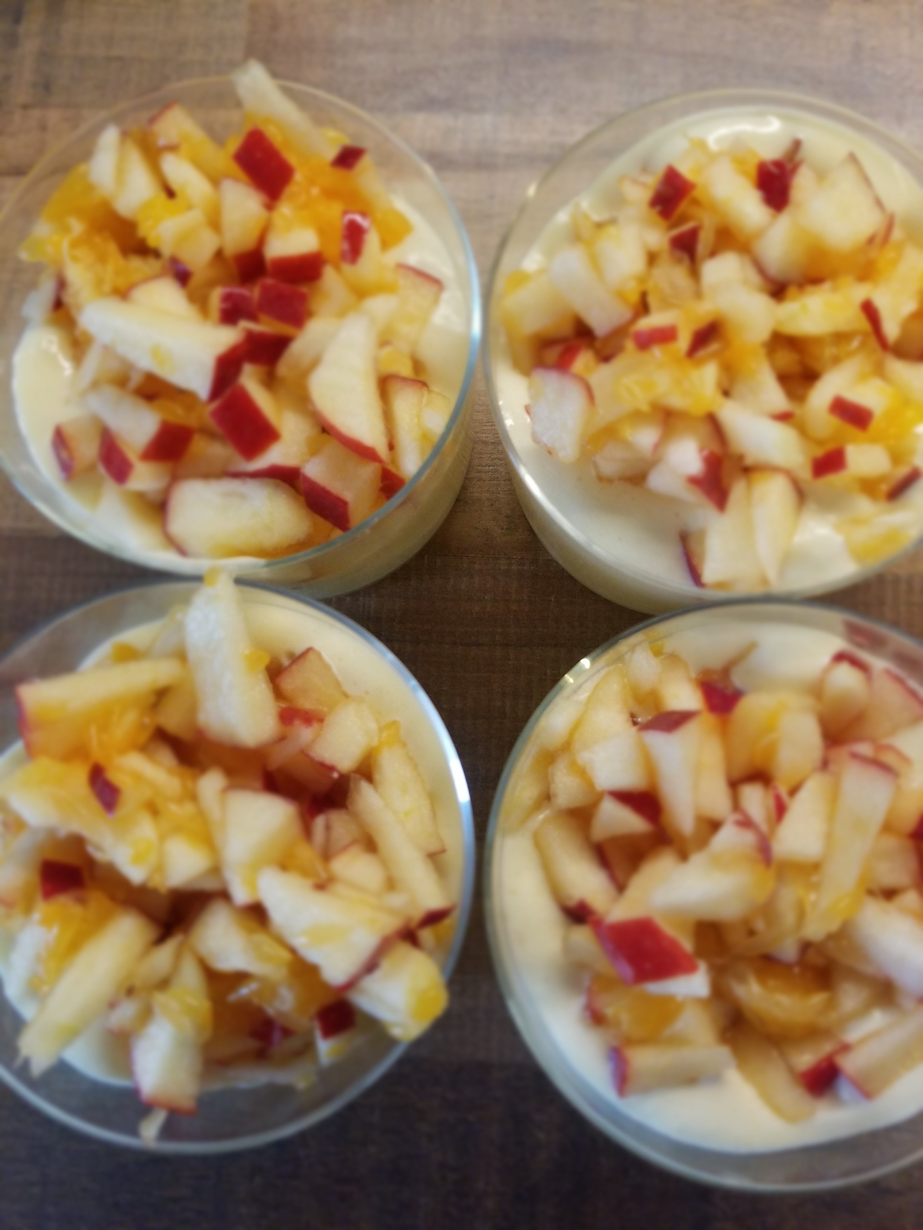 J’avais envie d’un dessert léger à base de mascarpone. Je me suis inspirée de ma recette de verrine à la mousse de mascarpone et aux fraise. Voici donc une recette plus hivernale à base de pomme et clémentine. Très simple et rapide.