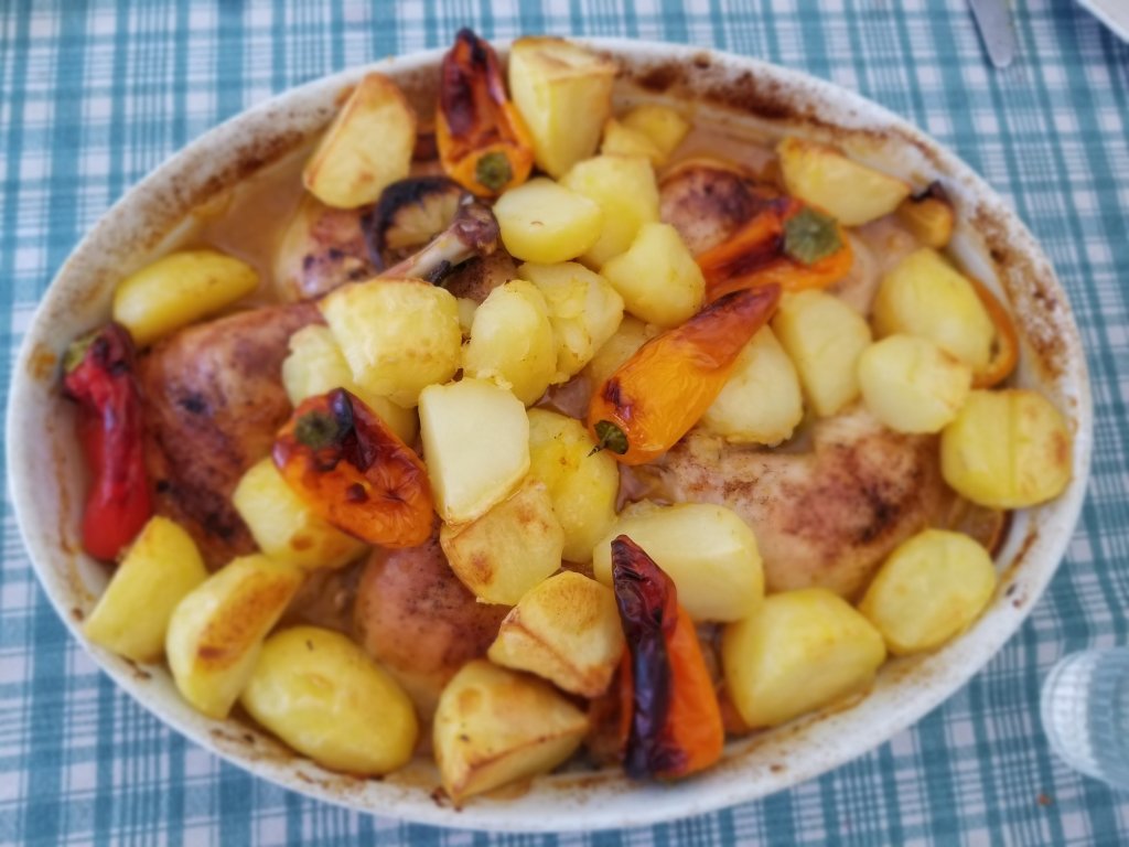 - Ajouter les pommes de terre (précuites 10 minutes à l’eau pour être sûr qu’elles soient bien cuites), les poivrons, une orange et un citron vert coupés en tranches.