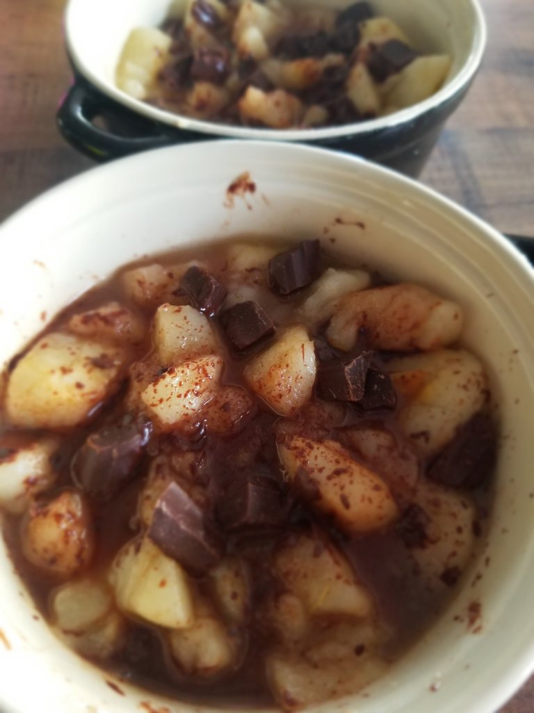 - Dans un plat à four (j’ai pris 2 petites cassolettes mais on peut prendre un plat à tarte ou à four), étaler les poires, les morceaux de chocolat et enfin le crumble.