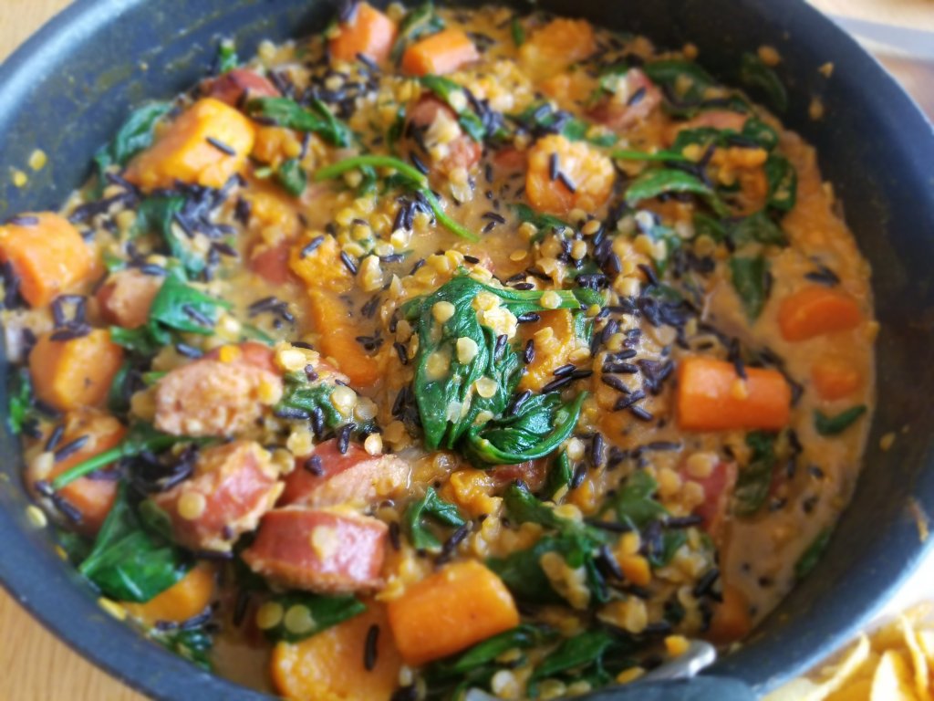- Ajouter les pousses d’épinard, le riz cuit et le lait de coco et remuer encore 5 minutes.
