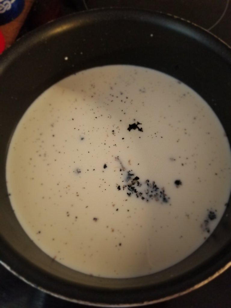 - Une fois le lait porté à ébullition, retirer les gousses de vanille et verser doucement le lait sur la préparation précédente.
