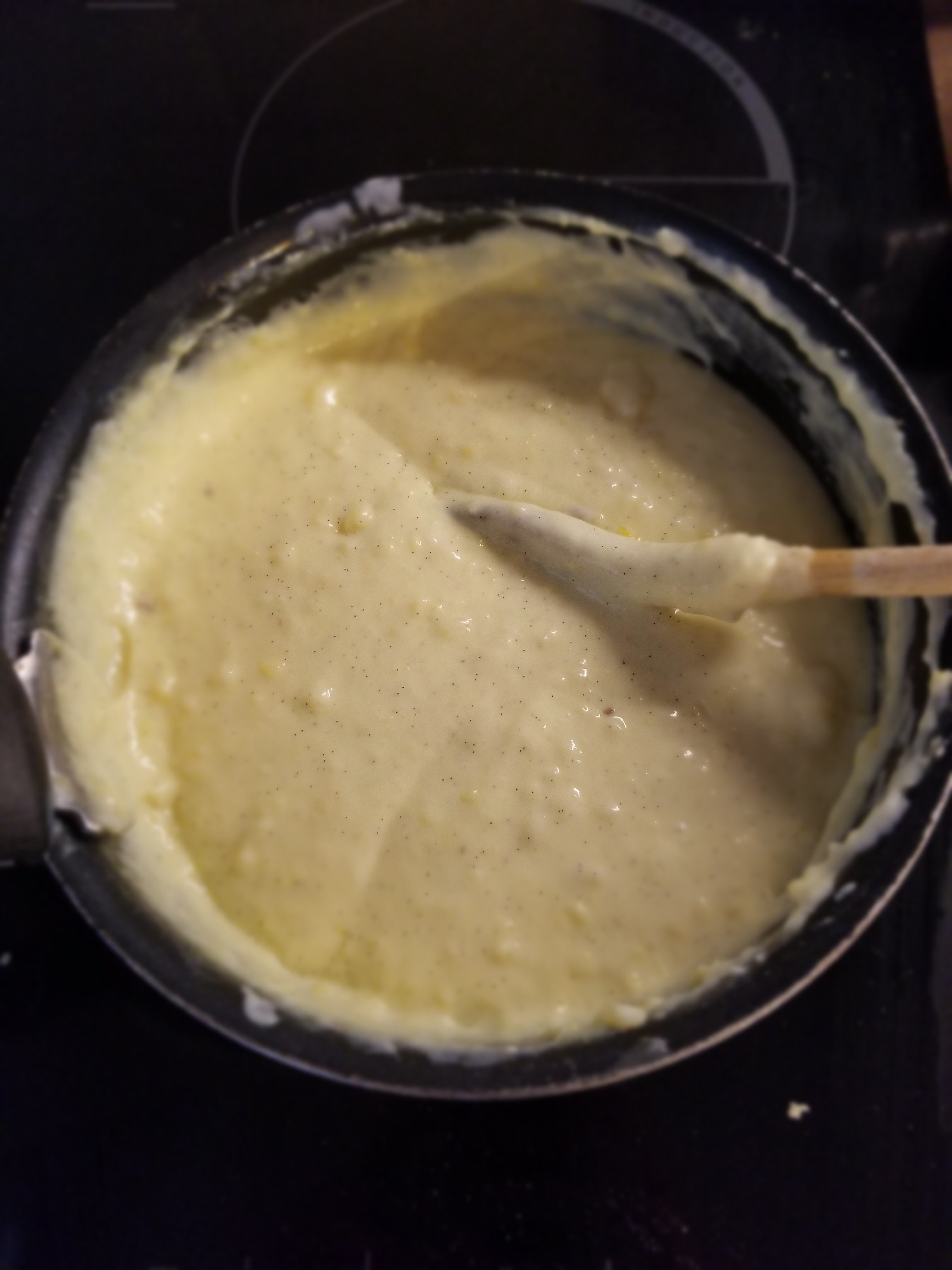 - Remettre le mélange dans la casserole et mélanger sur feu moyen. La crème a épaissi directement de mon côté donc je n’ai pas vraiment remis le tout à chauffer.