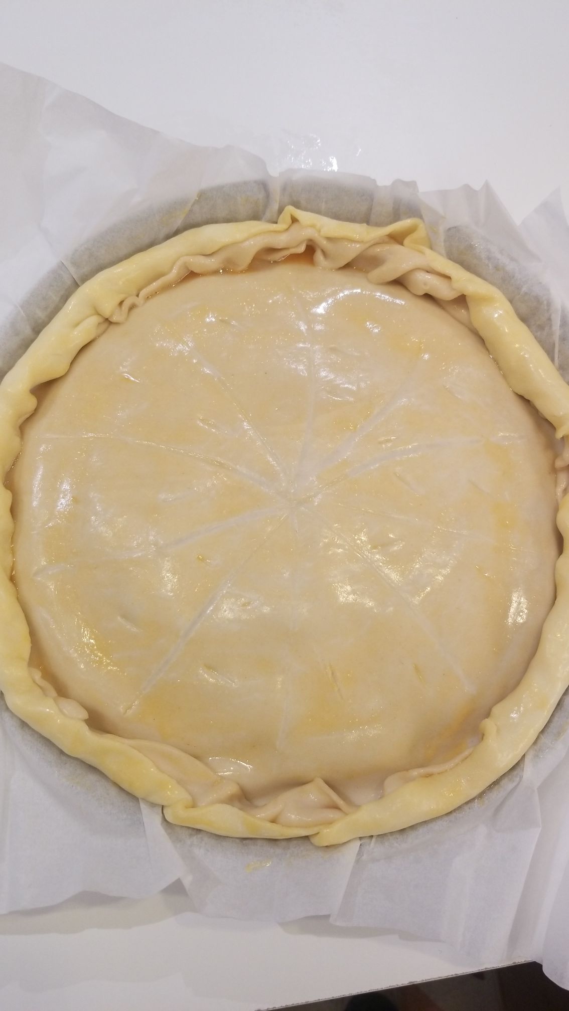 - Avec un pinceau, étaler un jaune d’œuf sur la pâte du dessus pour avoir une belle dorure.