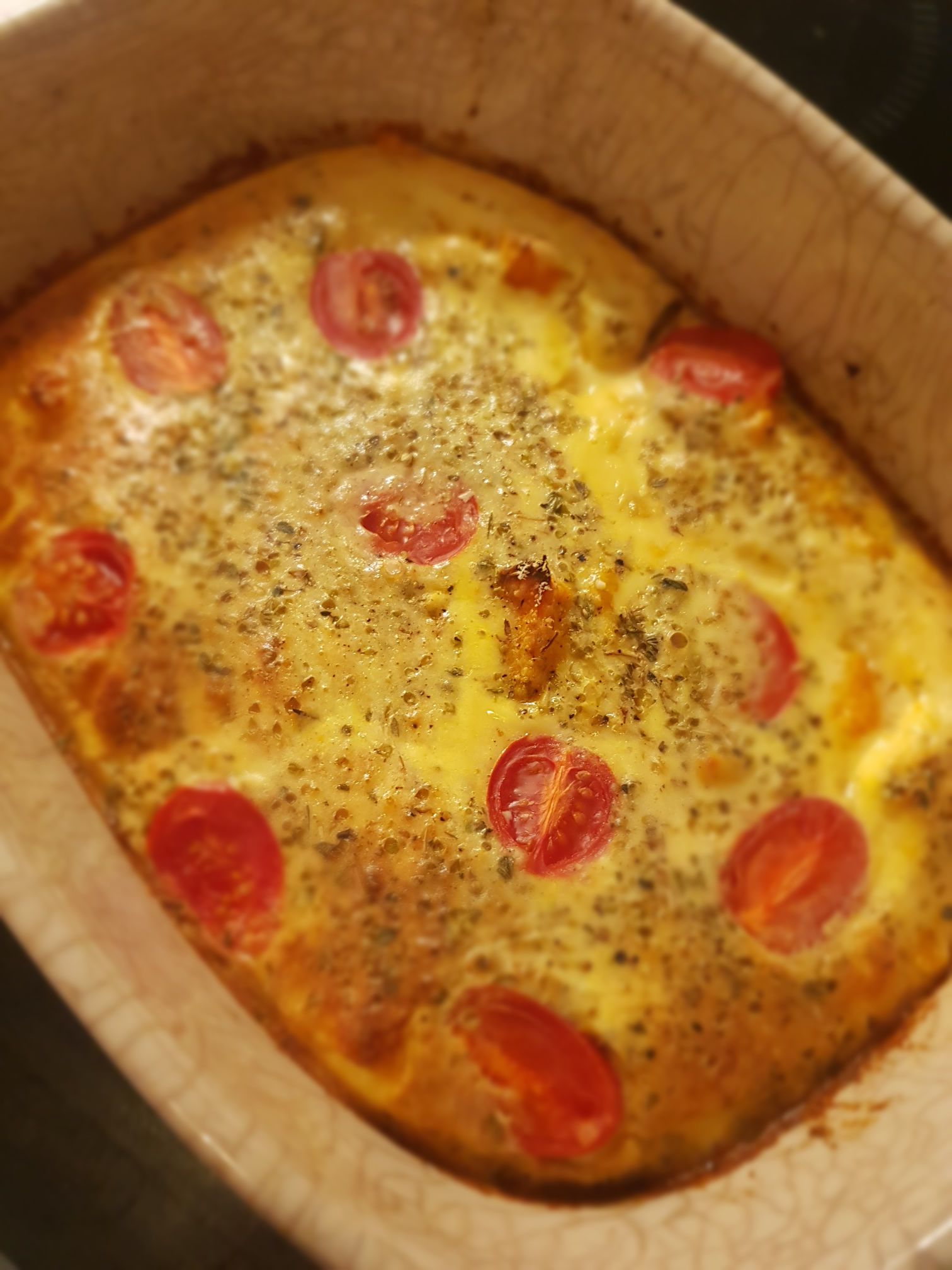 - Disposer l’appareil à clafouti par dessus. Assaisonner de parmesan et d’herbes de provence par dessus. J’avais également quelques tomates cerise que j’ai coupé en 2 pour faire joli.