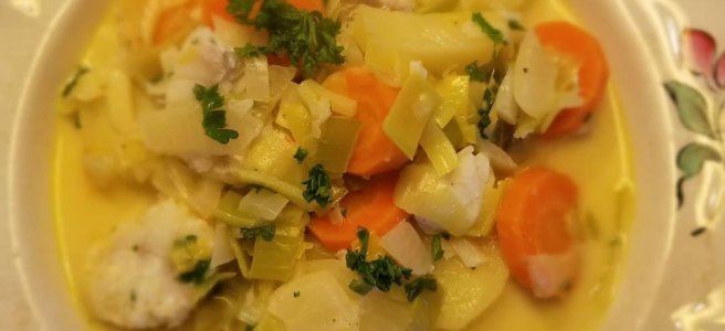 Waterzooi de cabillaud, carottes, poireau et chou rave