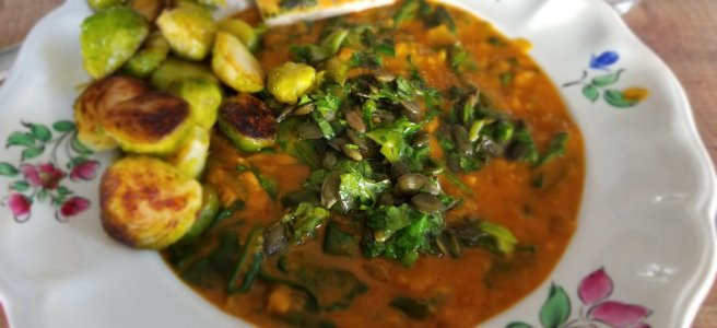 Voici un plat végétarien et gourmand. Réconfortant pour l'hiver que l'on peut accompagner de pains naans à la coriandre et huile d'olive. Dhal de lentilles avec choux de Bruxelles en accompagnement Recette pour 2 personnes - 45 minutes de préparation/cuisson Les ingrédients 1 bouillon cube de légumes1 oignon1 morceau de gingembre1 petite patate douce1 cuillère … Lire la suite de Dhal de lentilles, patates douces et épinards