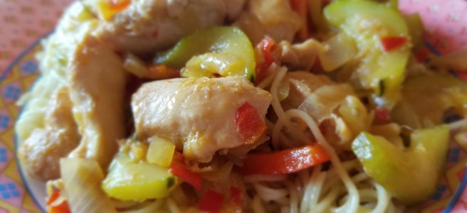 Inspirée par la cuisine asiatique depuis toujours, voici une recette très simple à réaliser, peu coûteuse mais avec un maximum de goût :)Les légumes peuvent être remplacés par des poireaux, des brocolis, des aubergines, des choux de Bruxelles, des carottes... il faudra juste adapter la cuisson en fonction des légumes choisis et potentiellement les cuire … Lire la suite de Noodles au poulet, courgettes et poivrons